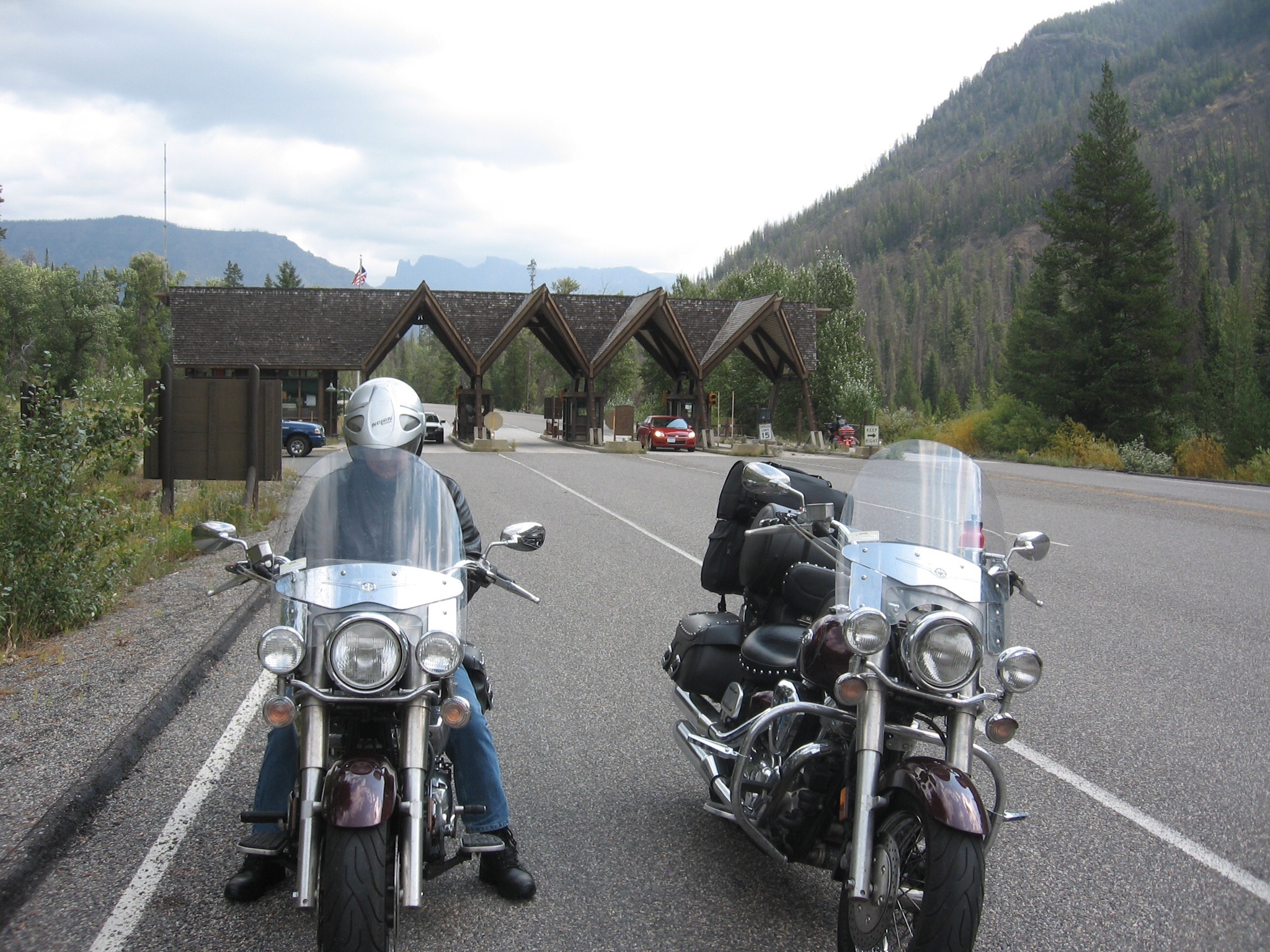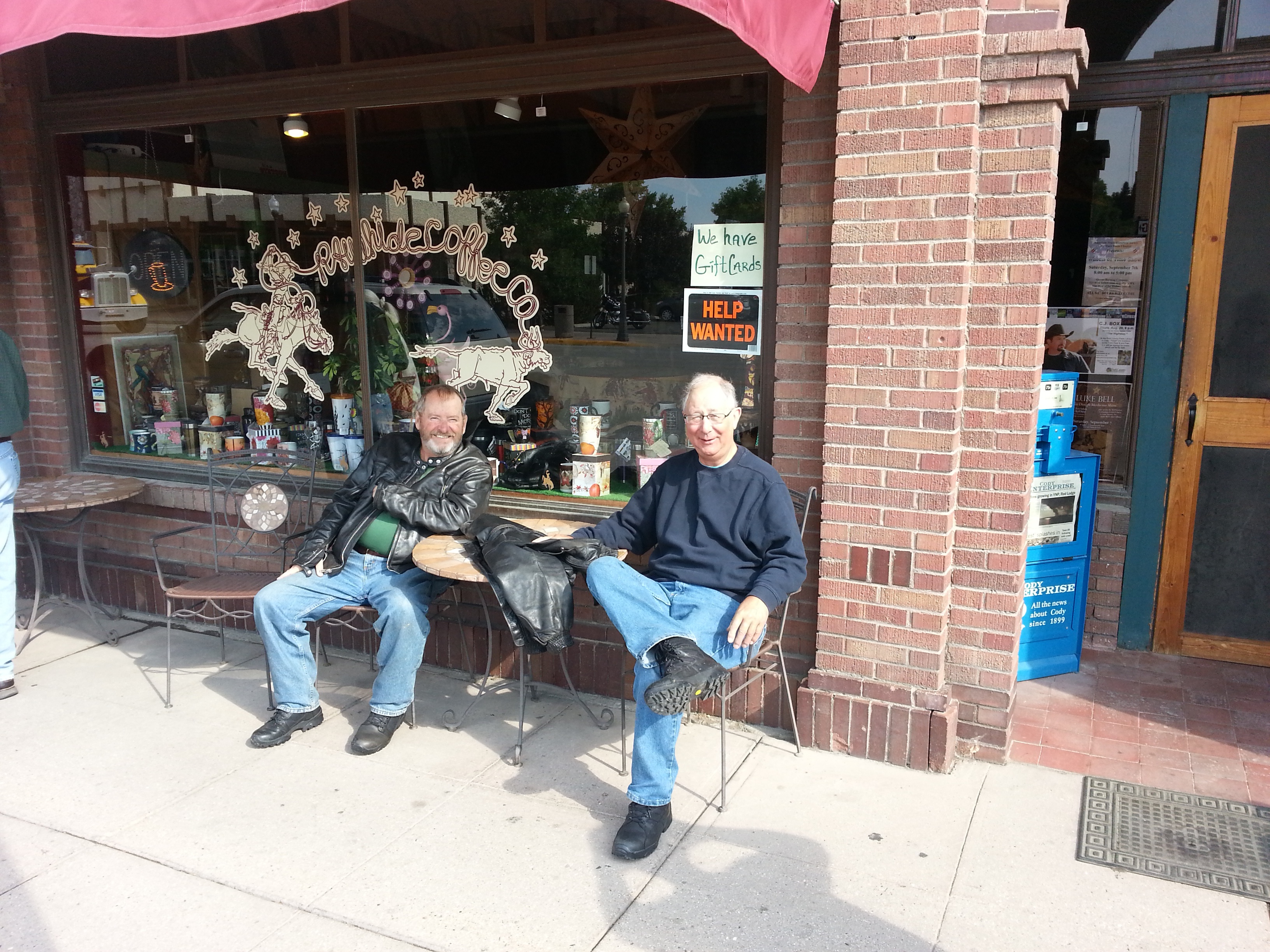 We started in Billings, MT and had a 100 mile ride to the park. When we got close on Hwy 212 we found out that the entrance ahead was closed due to fires. So we went an extra 75 miles South into Wyoming to go in that entrance. Actually the best ride of the day was from 212 down to Cody, WY and from their into the park. Had a great coffee in Cody (see pix). We applied for the job, but they said we were too old and crotchety.