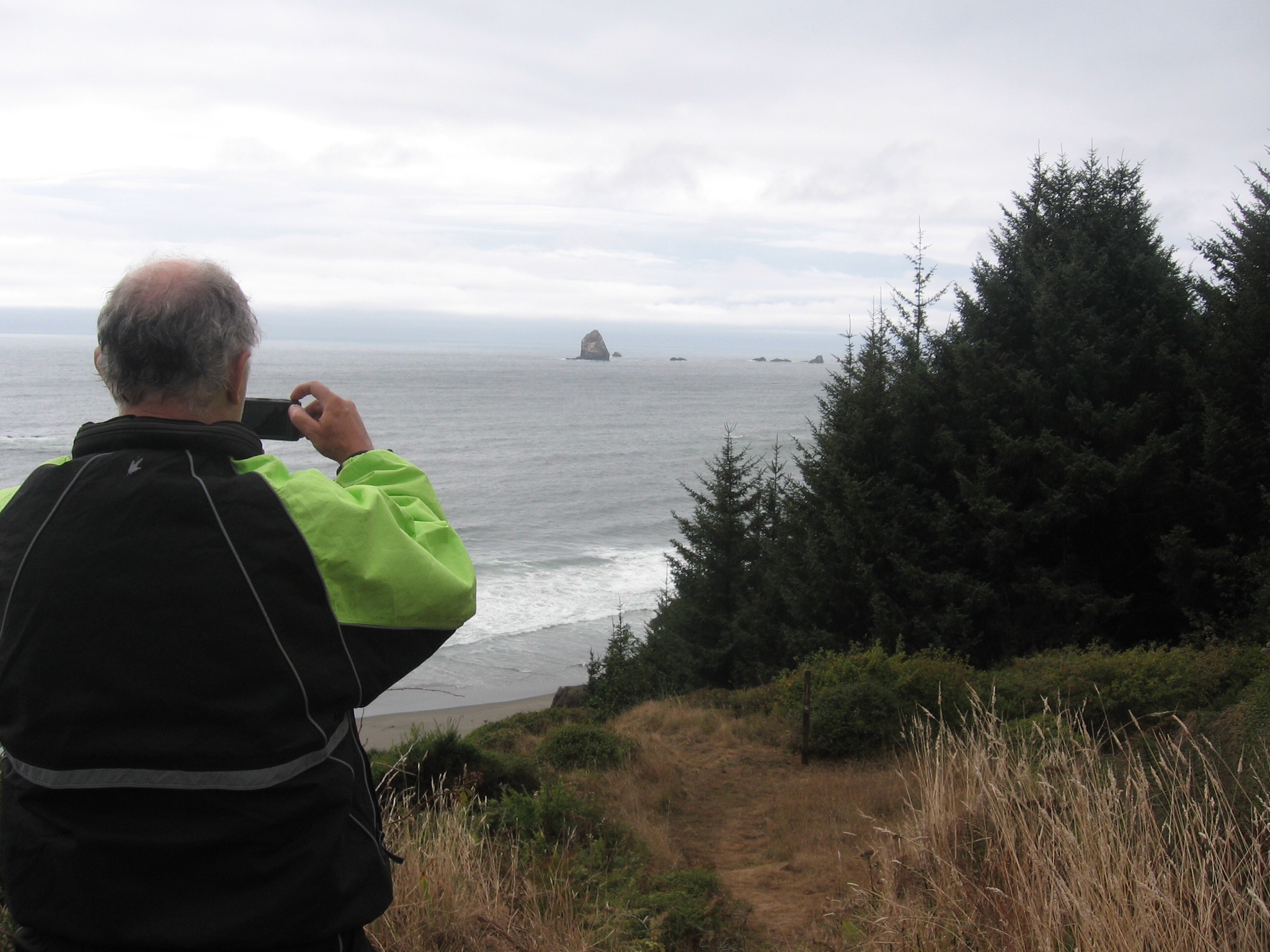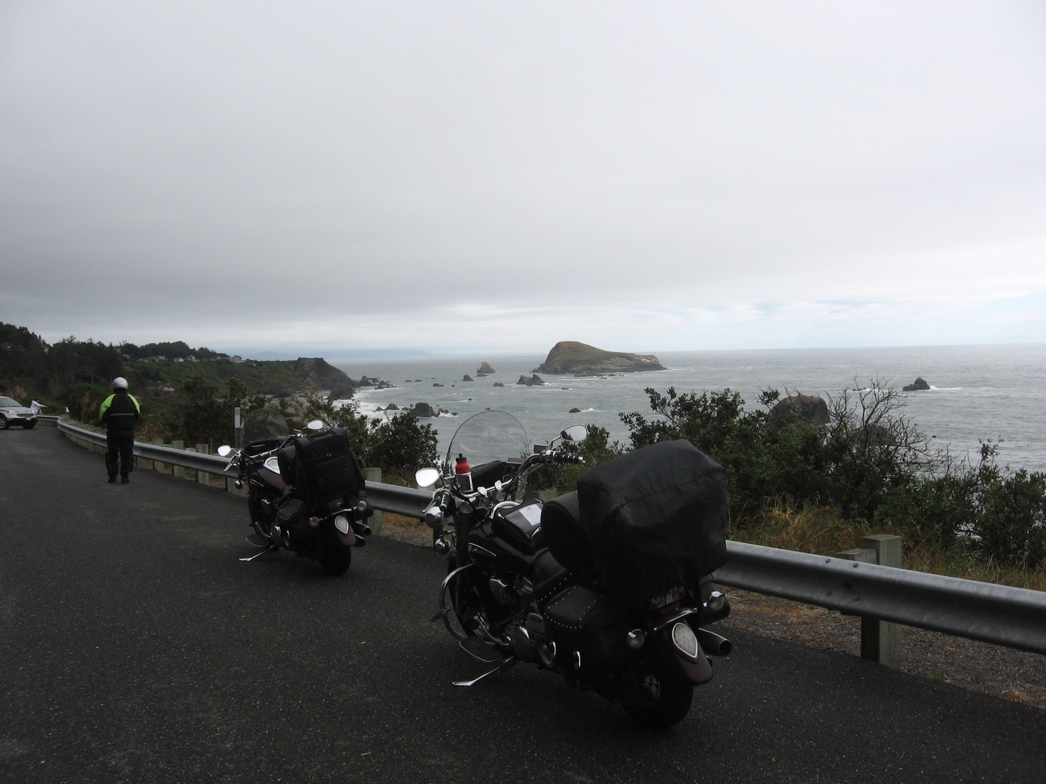 We had about 45 minutes of clear weather and dry roads. Then we just had semi-wet roads and some mist. Our goal was Brookings, OR because it is near the California border and the Redwoods National Park. Our bags leaked some–mine because I left one side pocket unzipped, and Andy’s because his rain cover for some reason does not fit over everything. We visited a laundramat and dried it all out in a few minutes.