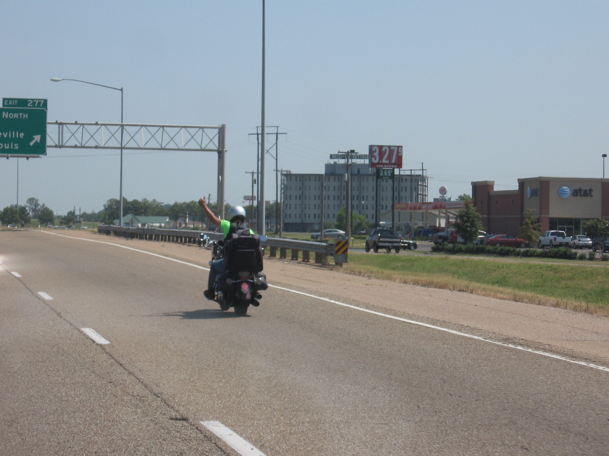The first pix is just for fun. I’ve always wanted to take a picture of an 18-wheeler being towed as if it were coming at me in the same lane. This was my chance. Then I snapped Andy peeling off on I-55 in West Memphis, Arkansas; next pix are Memphis. It is good to be back on the correct side of the Mississippi!