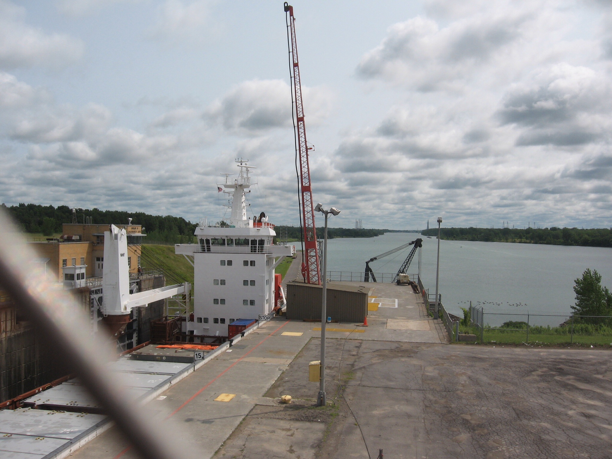 We hit it just right; a Copenhagen ship was just entering on the low side to be lifted up and out up river while another ship was waiting to go the other way. The second picture shows the ship being raised.