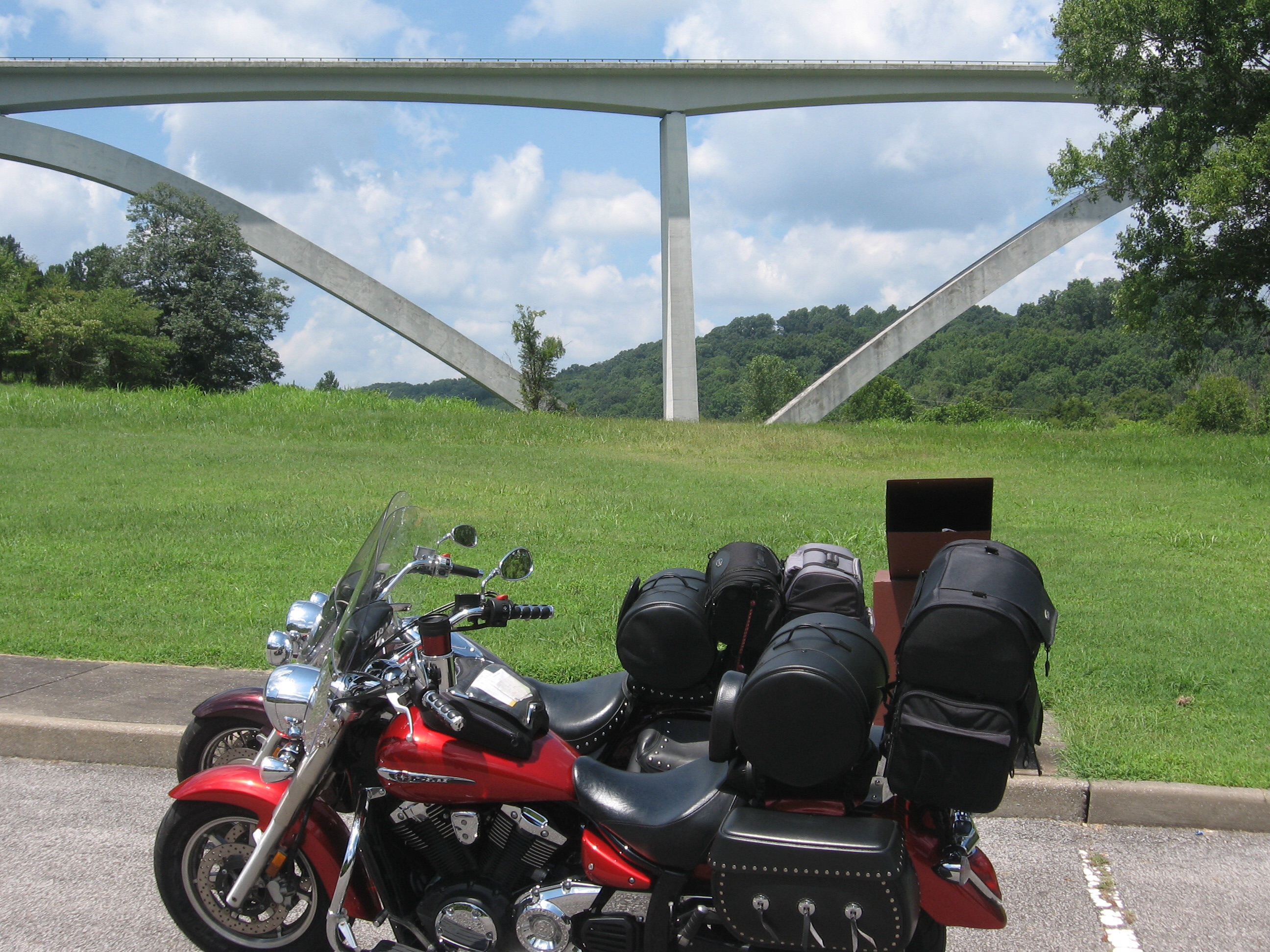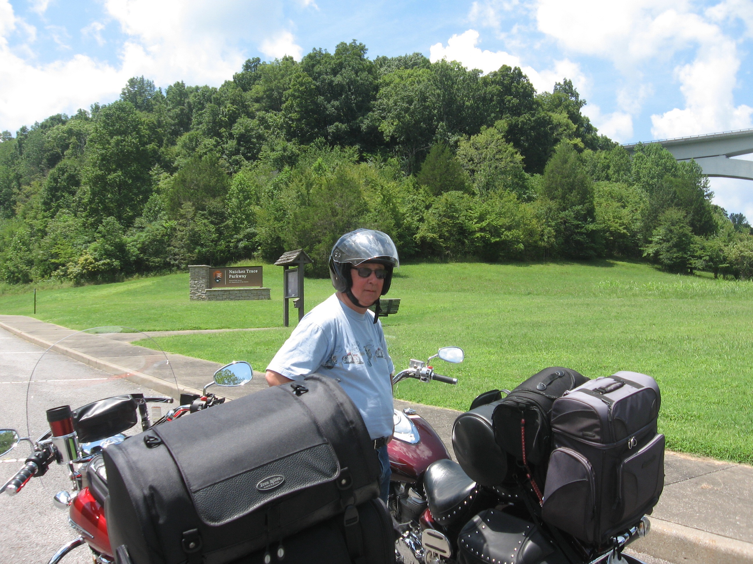 We left after lunch West on TN 96 to the Natchez Trace Parkway. Here we are at the start. The bridge is a famous double-arch bridge of the parkway over Hwy 96.