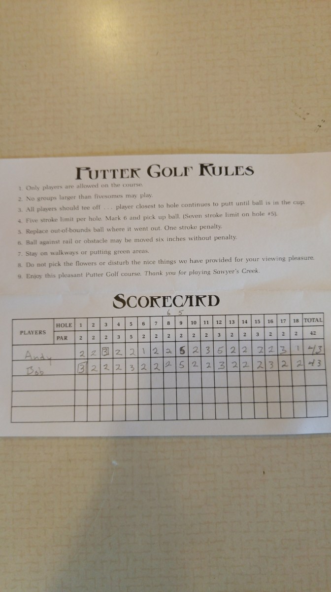 Sawyer’s Creek Scorecard__tied at one over par, 43 Published July 19, 2017 at 2976 × 5312 in Andy&Bob Mini-Golf Tour, Day 5, 7-18-2017 ← Previous Next →