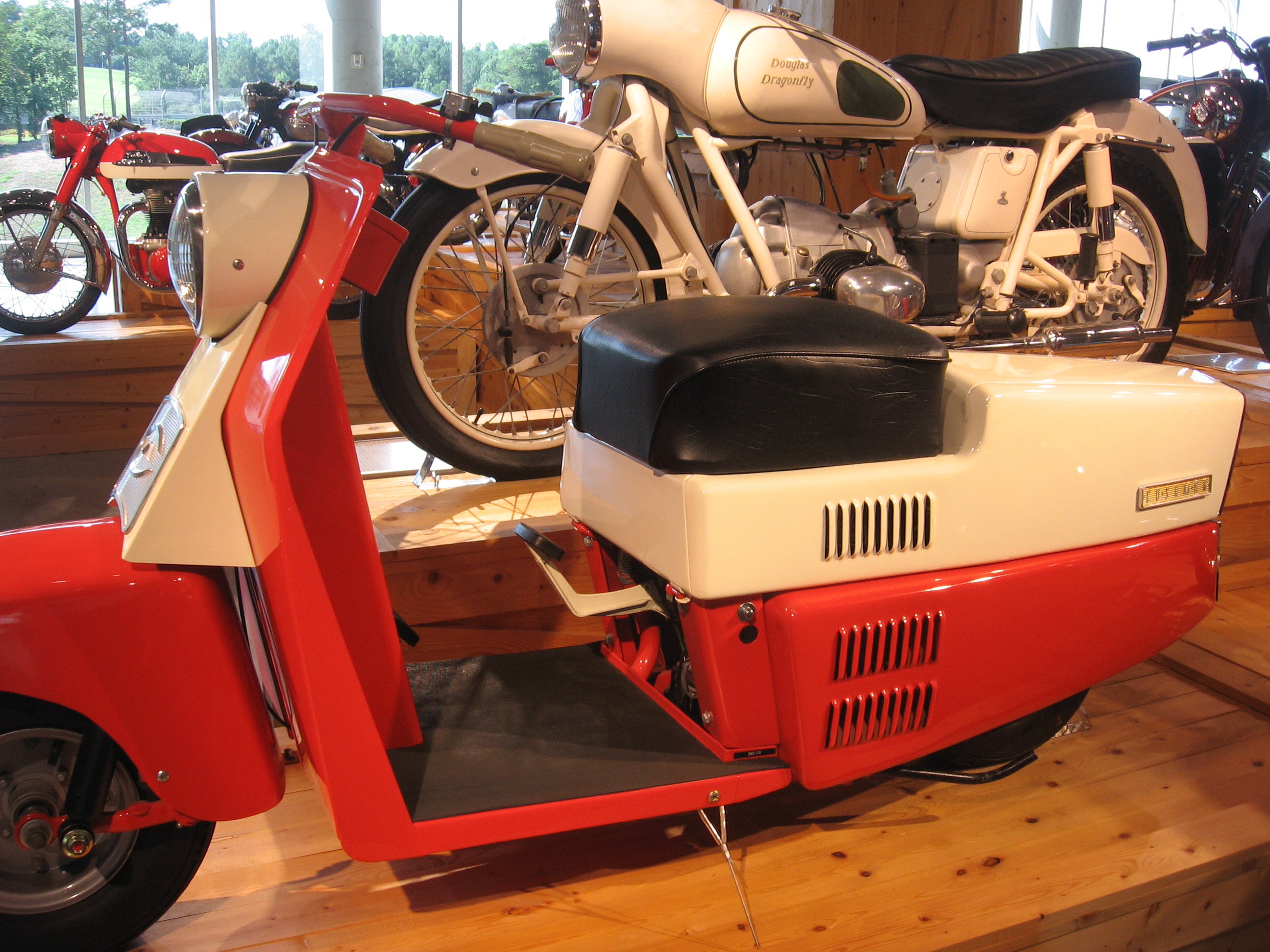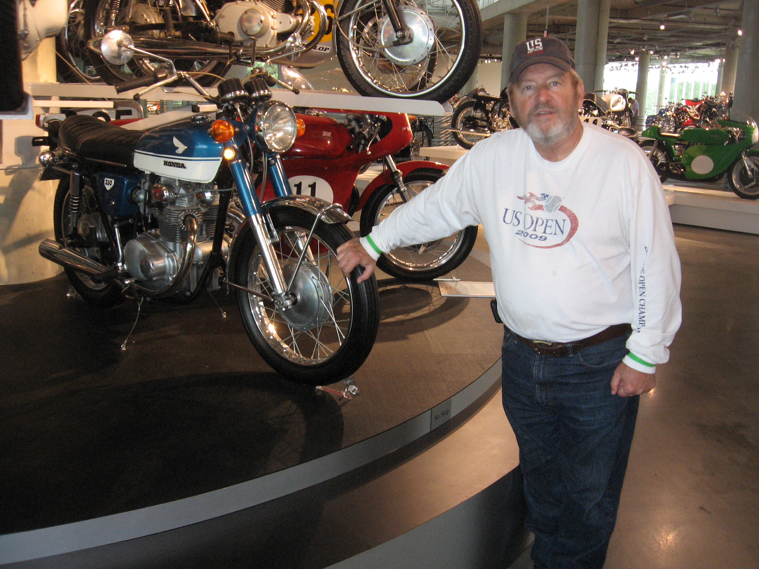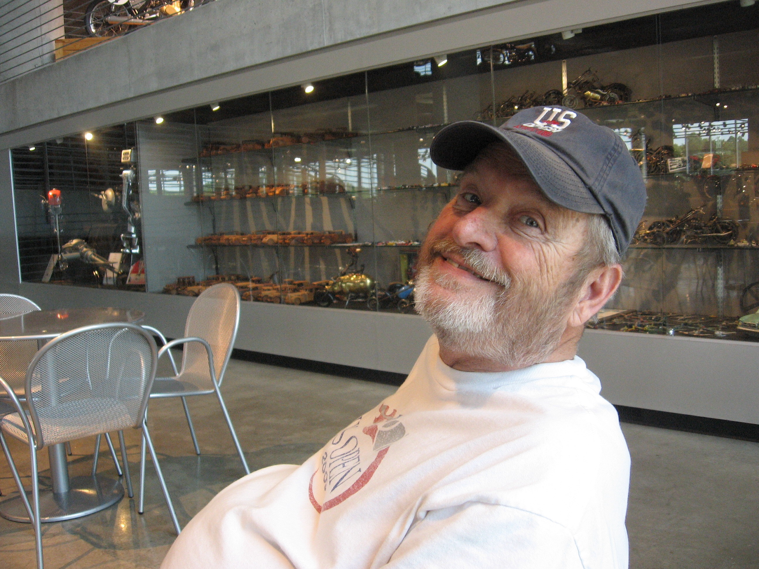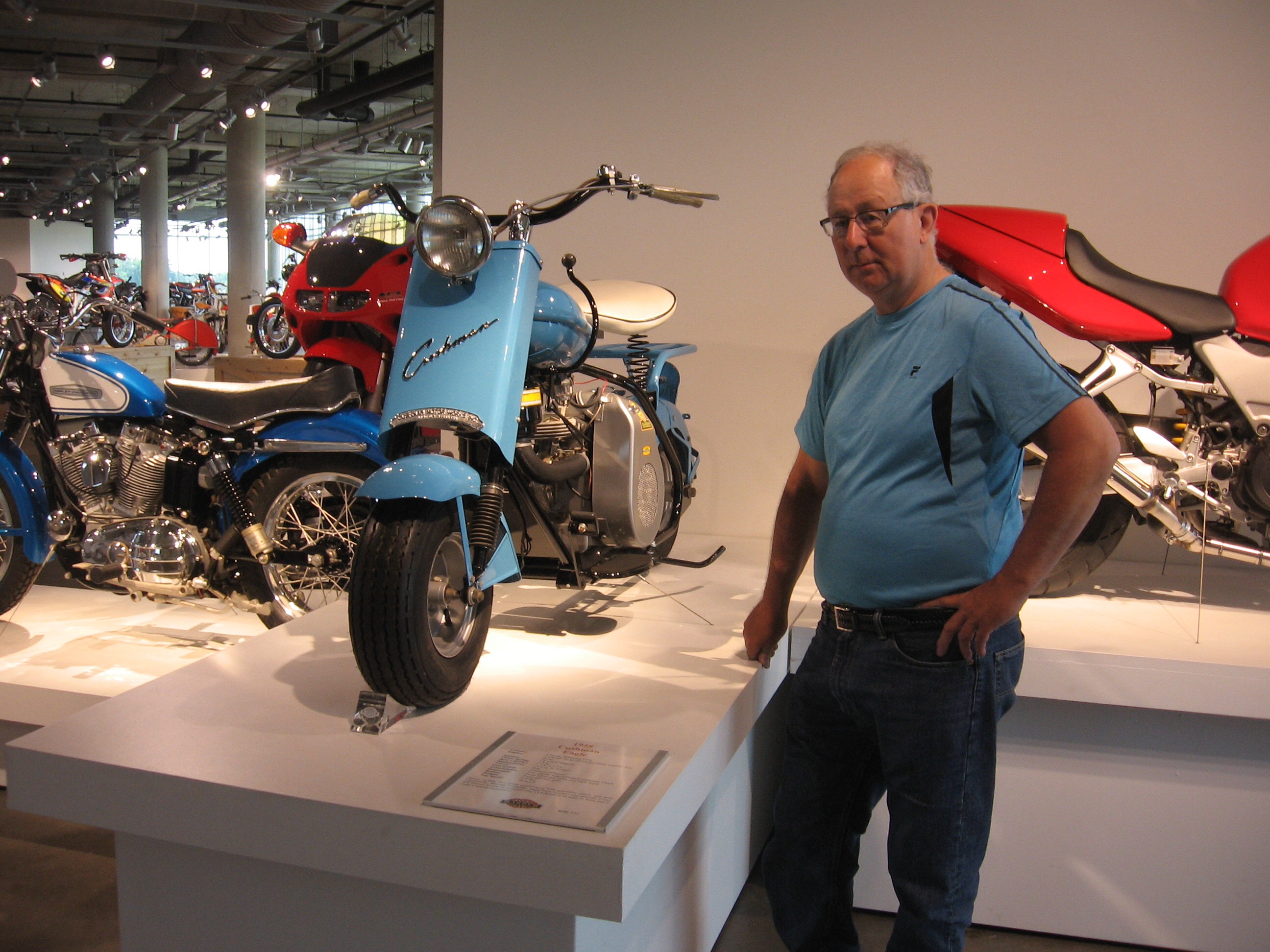I know–we are nuts. But every bike we have ever owned was there like the red Vespa (mine was blue), the red and white Cushman (just like mine), and the blue Cushman Eagle Andy in standing beside. They had at least 4 Cushman Eagles. We rode these scooters when we were 14–56 years ago–all over Michigan.